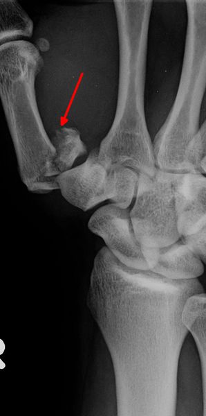 Bennettfraktur: basisnahe Schrägfraktur mit Gelenkbeteiligung, das Metacarpale I wird durch Sehnenzug bei dieser Bruchform immer verschoben werden.